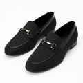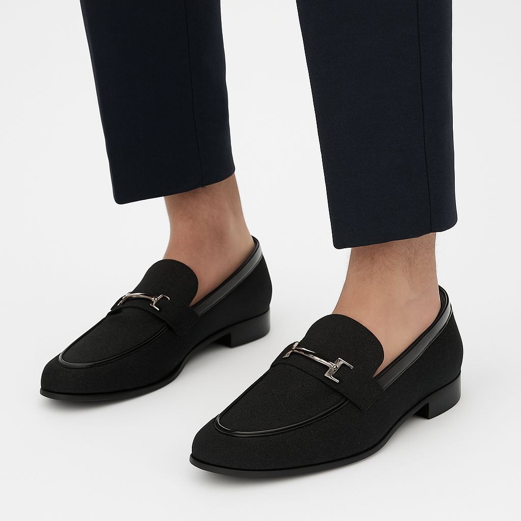BLACK GLITTER FABRIC LOAFERS WITH METAL BUCKLE