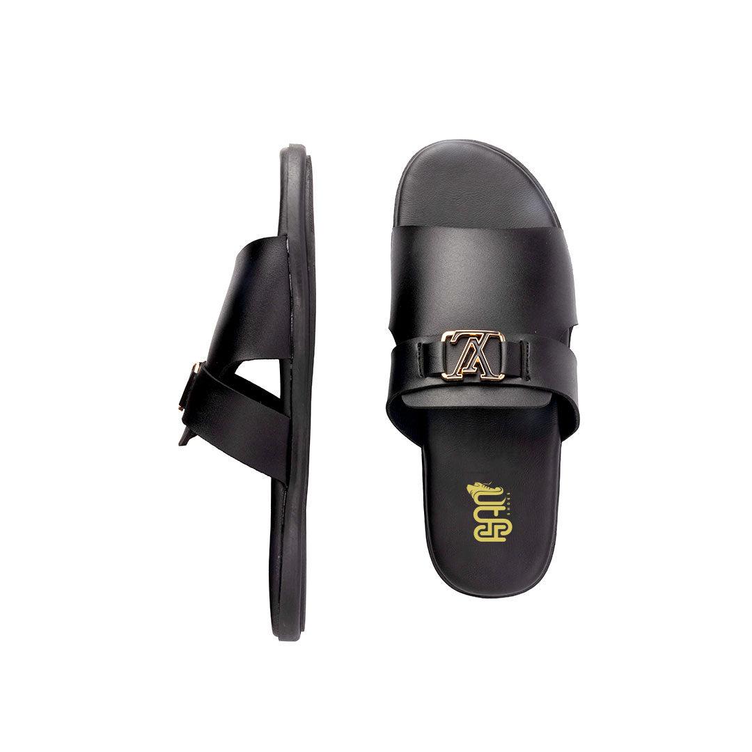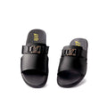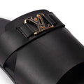 A pair of men's black leather slides featuring a wide strap across the top of the foot. The strap is adorned with a prominent gold-tone buckle that forms an "LV" style logo. The slides have a textured, non-slip sole for improved grip. They appear to be a stylish and casual footwear option.