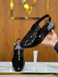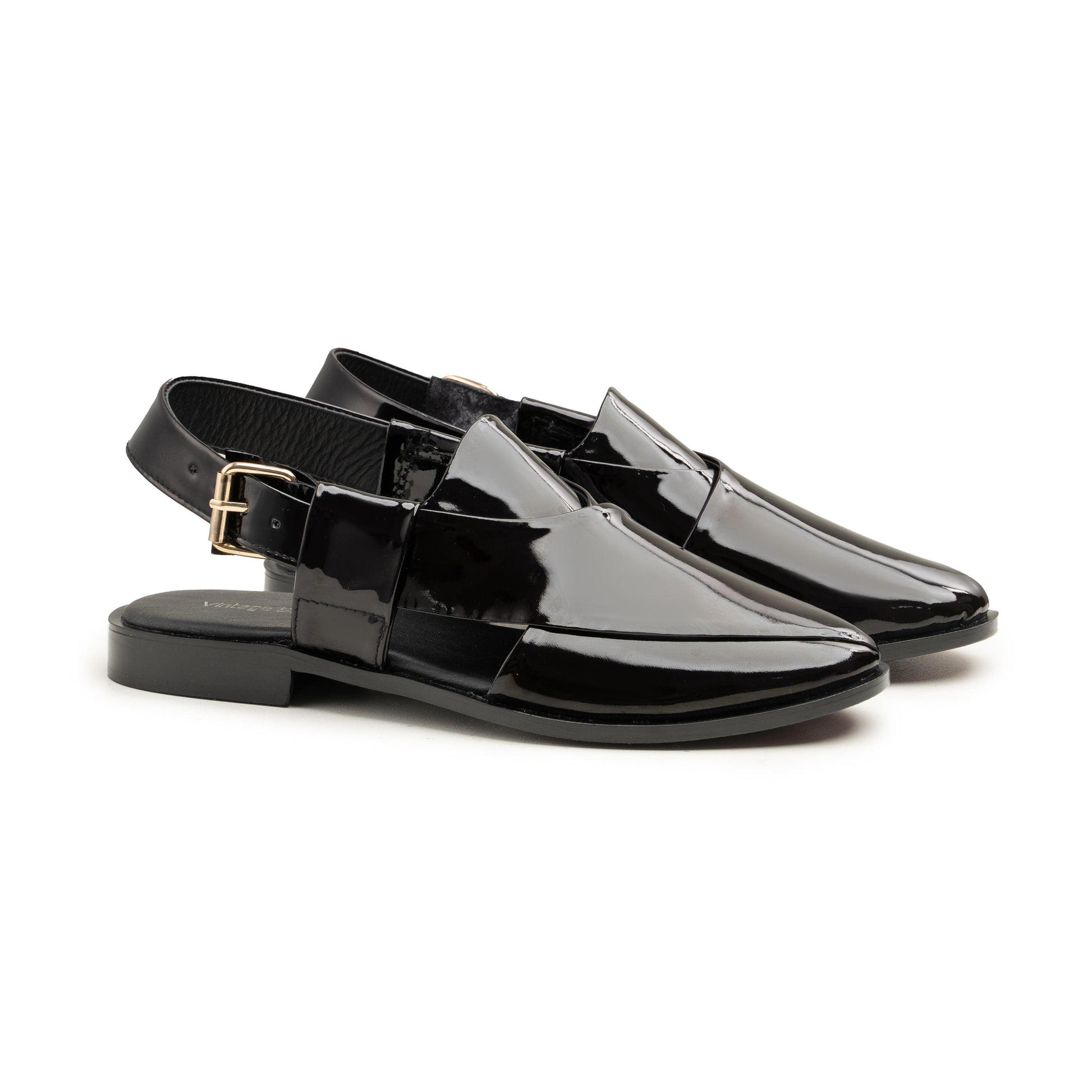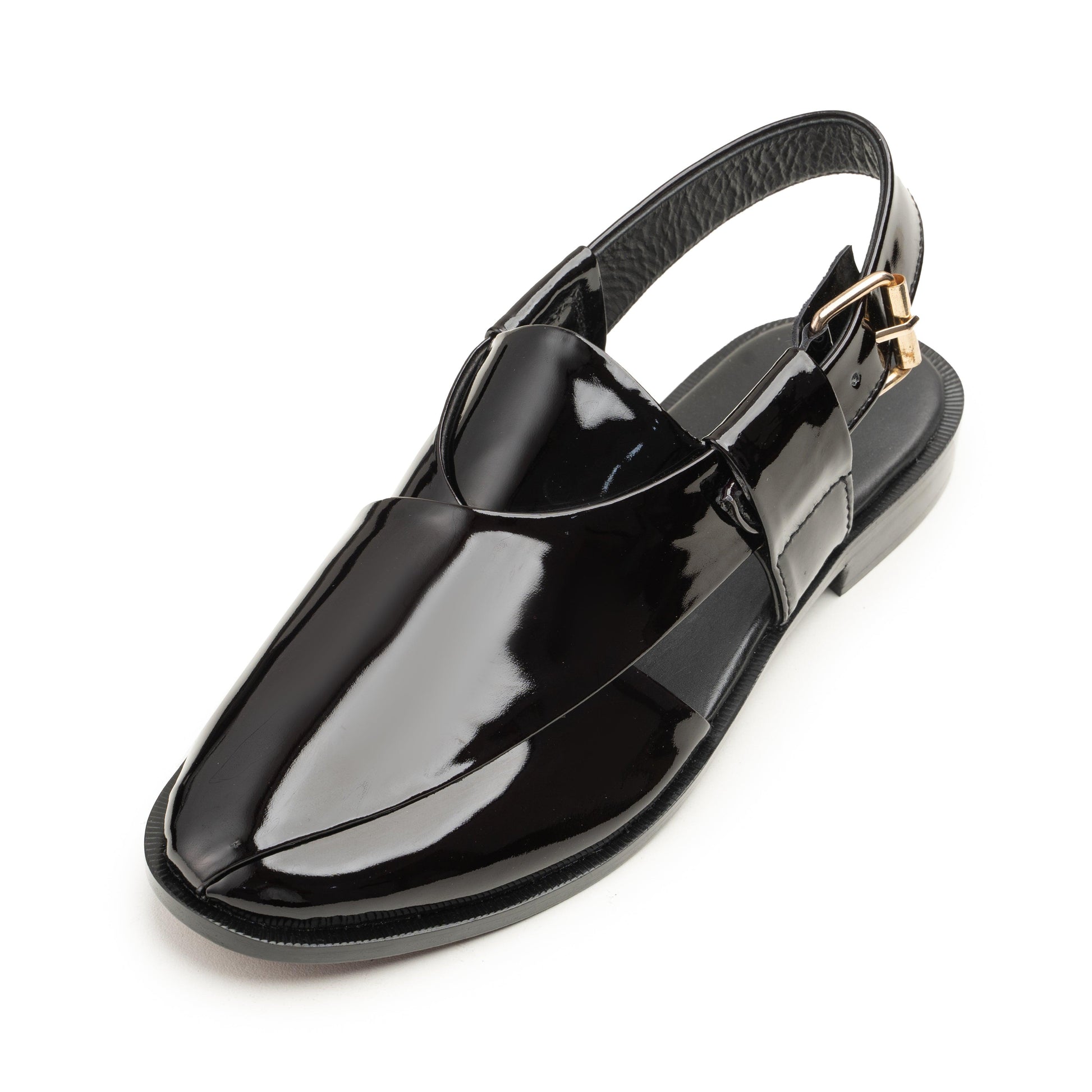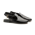 This is a contemporary take on the classic Peshawari Chappal, featuring a sleek, shiny, patent leather-like finish. The footwear maintains the traditional closed-toe design with a crisscross strap pattern over the instep, but the glossy material gives it a formal and modern look. The shoe has a backstrap with a silver-toned buckle for an adjustable fit. This style is suitable for both traditional and semi-formal occasions, offering a polished alternative to the typical matte or textured leather Peshawari Chappal.